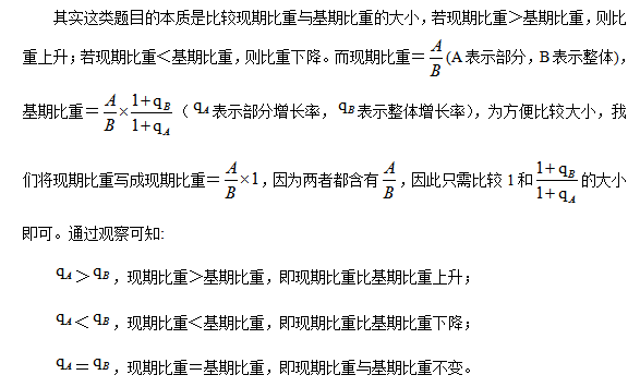 通過以上兩個例題相信大家已經掌握了判斷比重變化這類題目的解題方法。當我們在用以上結論時需要注意兩個點:①題目所問的上升或下降是現(xiàn)期比重比基期比重還是基期比重比現(xiàn)期比重。②若已知比重的變化情況,也可以利用這個結論來推出