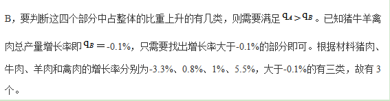 已知部分值、整體值及兩者的增長率,計算比重增長量,計算時可結合選項特點先通過部分增長率和整體增長率的大小判斷比重增長量的正負,再計算部分增長率-整體增長率的結果,實際結果應小于計算結果,部分題目可以直接鎖定答案。當根據選項不能直接鎖定答案時,可簡單估算選答案。