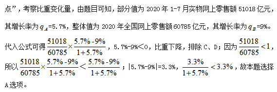 例題:2020年1-7月份,全國網上零售額60785億元,同比增長9.0%,比1-6月提高1.7個百分點。其中,實物商品網上零售額51018億元,增長5.7%。