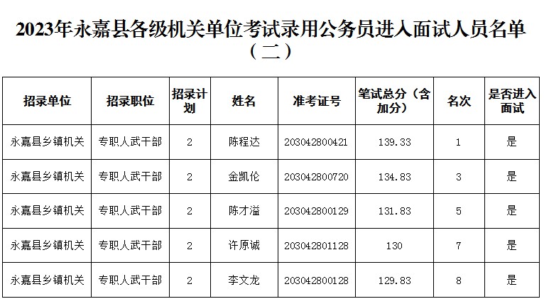 2023年浙江公務(wù)員考試溫州永嘉縣面試人員名單(二)