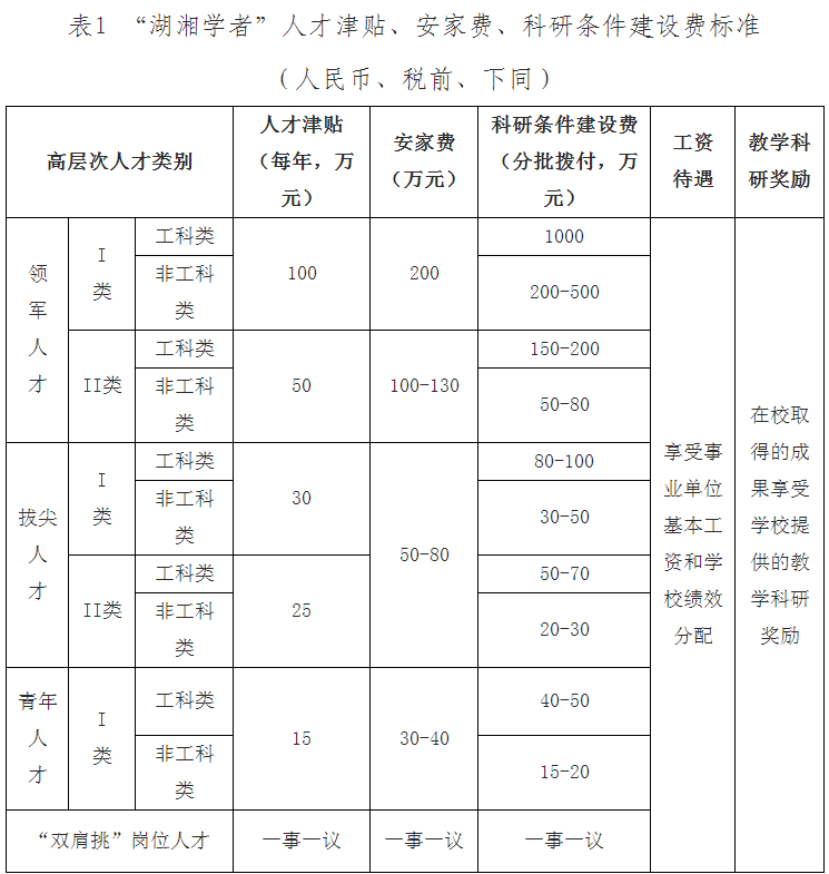 2.專任教師薪酬待遇按事業(yè)單位工資體系和學??冃Х峙渲贫葓?zhí)行,在校取得的成果可享受學校的教學科研獎勵;優(yōu)秀博士人才將提供安家費最高25萬元,科研啟動費最高8萬元,入職后即可申請,并提供過渡性住房保障。進校后,業(yè)績成果突出者可申報“湖湘學者”特聘崗位并享受相應(yīng)待遇。