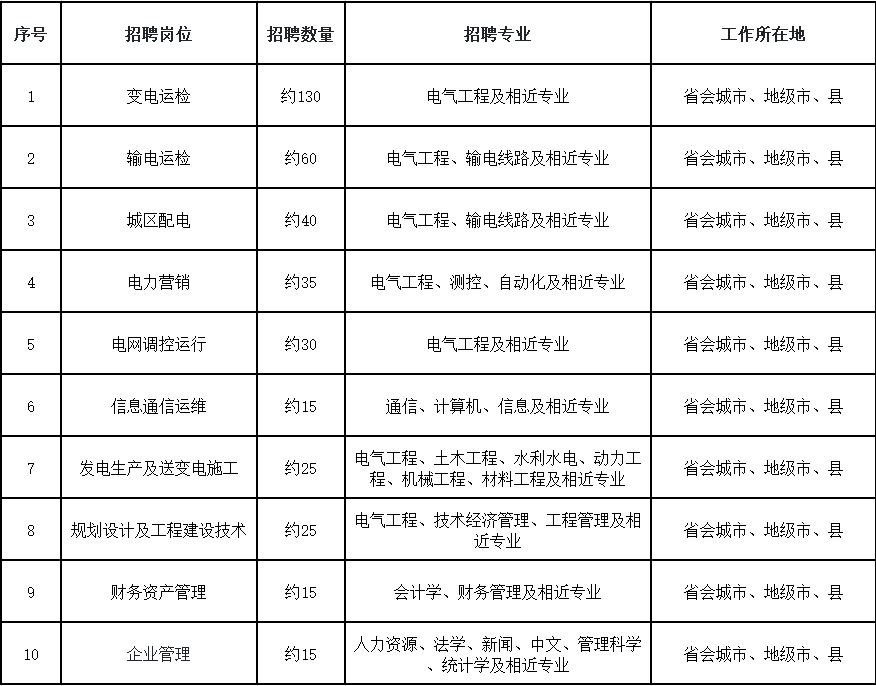 說明:1.最終招聘數(shù)量將視畢業(yè)生應(yīng)聘情況、流失情況、國(guó)家電網(wǎng)有限公司核定情況做相應(yīng)調(diào)整。2.同等條件下,退役軍人優(yōu)先錄用。