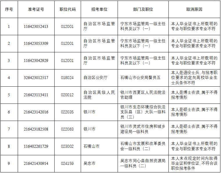 根據(jù)《寧夏回族自治區(qū)2023年考試錄用公務(wù)員公告》相關(guān)規(guī)定,自治區(qū)公務(wù)員局會同有關(guān)部門及各招錄機關(guān)對2023年全區(qū)考試錄用公務(wù)員擬進入面試的報考者進行了資格復(fù)審。復(fù)審中發(fā)現(xiàn),部分報考者不符合職位資格條件,部分報考者放棄面試資格,個別職位達不到面試開考比例。經(jīng)自治區(qū)公務(wù)員主管部門研究,決定取消部分報考者面試資格,降低部分職位面試開考比例?,F(xiàn)將有關(guān)情況公告如下: