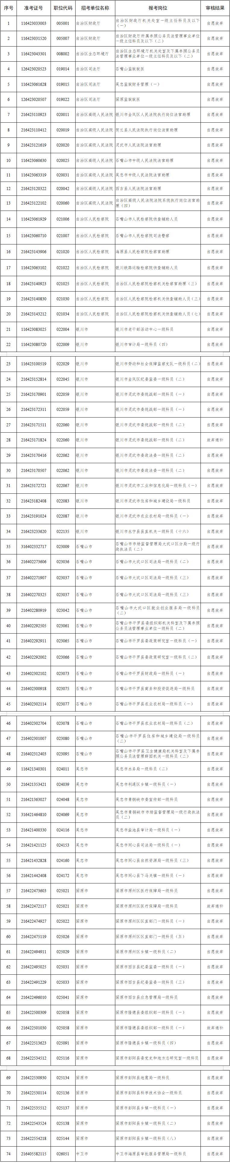 寧夏回族自治區(qū)2023年考試錄用公務(wù)員資格復(fù)審結(jié)果公告