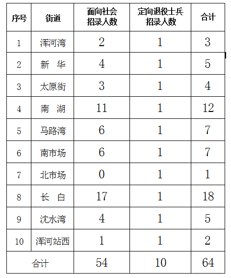 本次公開(kāi)招錄社區(qū)工作者64人,其中面向社會(huì)招錄54人,定向招錄退役士兵10人。
