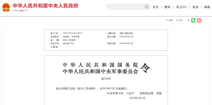 2023年4月12日,國務院網站公布新修訂的《征兵工作條例》: