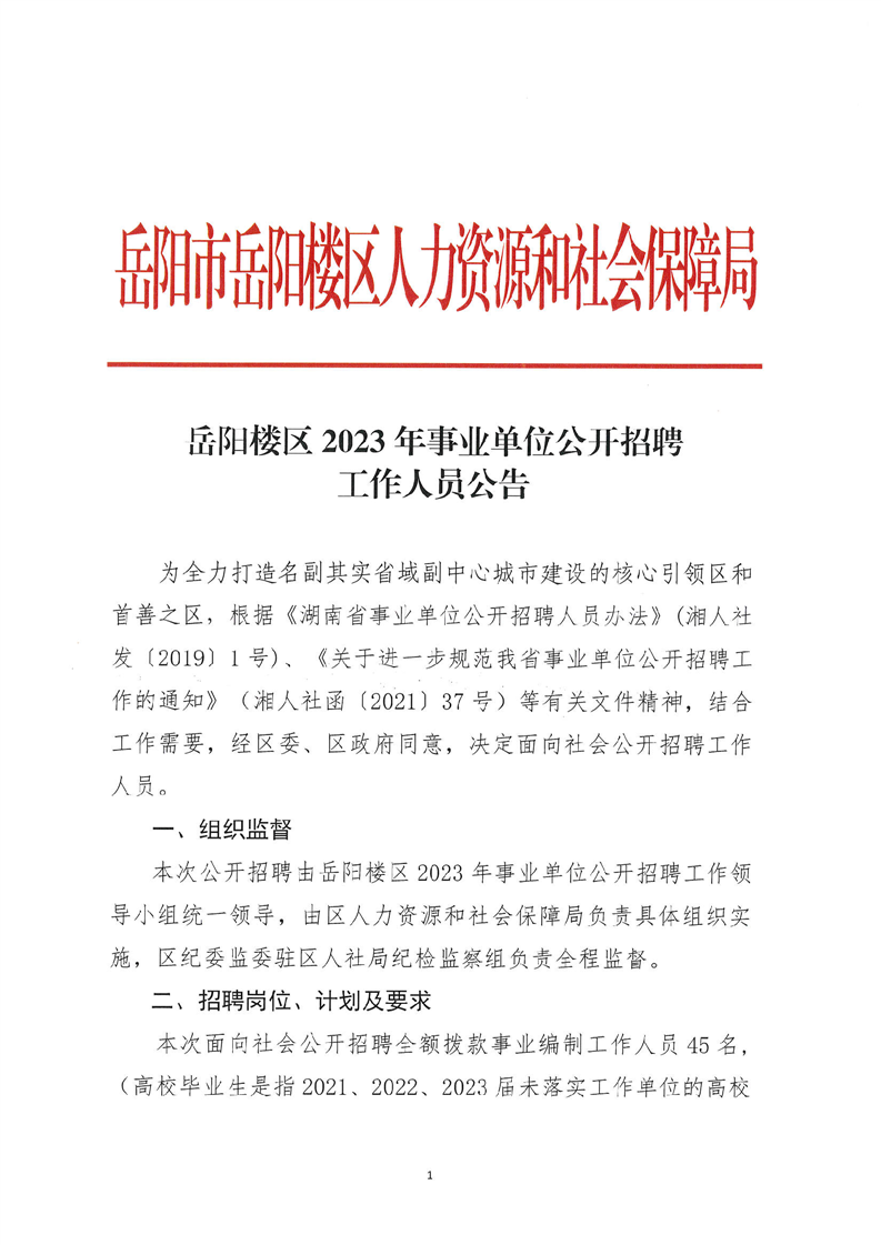 2023年湖南岳陽(yáng)市岳陽(yáng)樓區(qū)事業(yè)單位招聘45人公告
