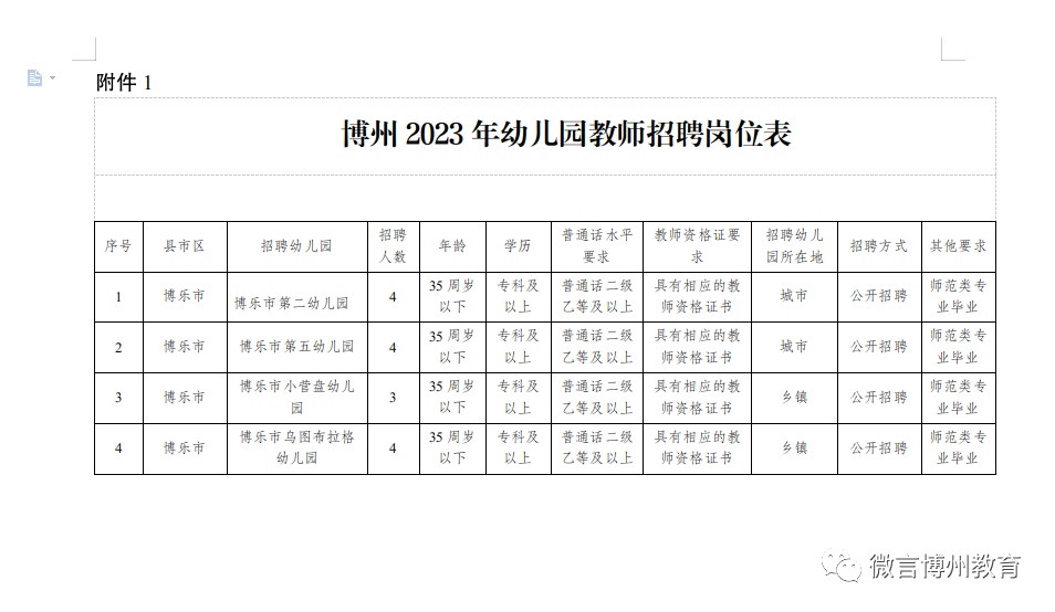 1.博州2023年面向社會(huì)公開(kāi)招聘幼兒園教師崗位表