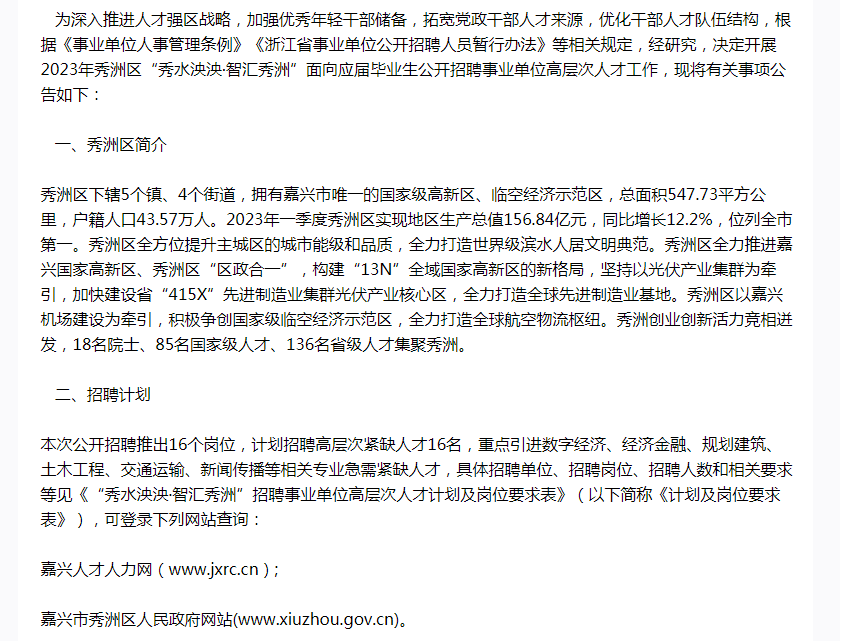 2023年秀洲區(qū)“秀水泱泱·智匯秀洲”面向應(yīng)屆畢業(yè)生公開招聘事業(yè)單位高層次人才公告