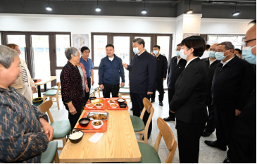 臨近中午,社區(qū)食堂內(nèi),幾名老人正在用餐,見(jiàn)到總書(shū)記來(lái)了,紛紛起身問(wèn)好。