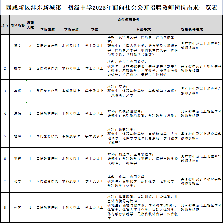 招聘崗位所需的具體條件以附件《西咸新區(qū)灃東新城第一初級中學2023年面向社會公開招聘教師崗位需求一覽表》的要求為準。