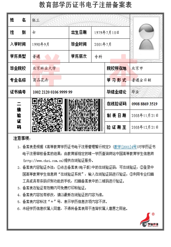 《教育部學(xué)歷證書電子注冊(cè)備案表》樣本