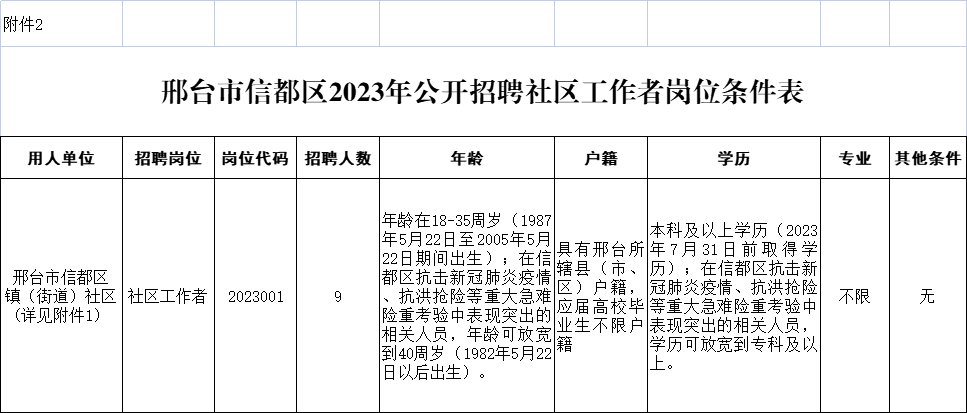 1.招聘崗位人數(shù)和其他具體條件詳見《邢臺(tái)市信都區(qū)2023年公開招聘社區(qū)工作者崗位條件表》(附件2),國(guó)外留學(xué)生須出具教育部留學(xué)認(rèn)證中心提供的學(xué)歷學(xué)位認(rèn)證書。