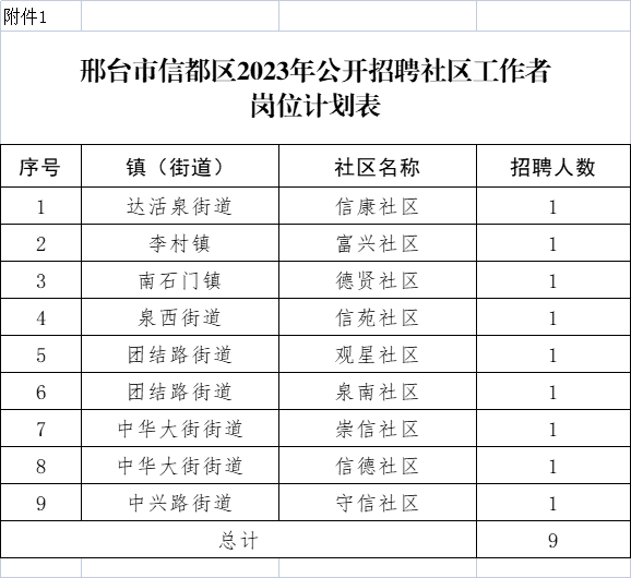 公開招聘社區(qū)工作者共9名,具體崗位計(jì)劃詳見《邢臺(tái)市信都區(qū)2023年公開招聘社區(qū)工作者崗位計(jì)劃表》(附件1)。