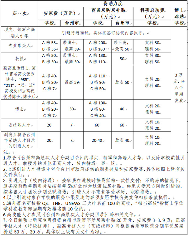 聘用人員除按國家有關(guān)規(guī)定享受工資、保險等待遇外,符合我校高層次人才標準的,將提供購房補貼、安家費、科研啟動費等方面的待遇。具體見下表: