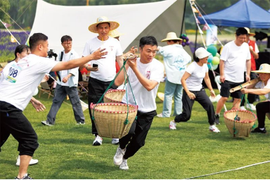 浙江省持續(xù)深化“千萬工程”,推動(dòng)“物的新農(nóng)村”向“人的新農(nóng)村”邁進(jìn),努力把農(nóng)村建設(shè)成農(nóng)民身有所棲、心有所依的美好家園。圖為2023年5月26日,浙江省湖州市2023年“我們的村運(yùn)”活動(dòng)在南太湖新區(qū)濱湖街道塘甸村舉行,共有12支代表隊(duì)100多名農(nóng)民運(yùn)動(dòng)員參加比賽,共享運(yùn)動(dòng)趣味。浙江省委宣傳部供圖