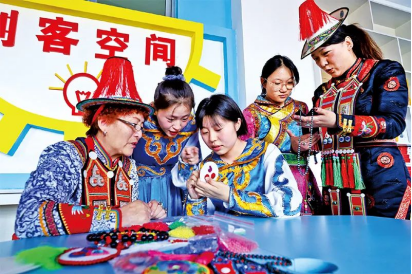 近年來,甘肅省張掖市肅南裕固族自治縣將非遺項目引進課堂,培養(yǎng)高素質(zhì)技能型人才,助推青年就業(yè)創(chuàng)業(yè)。圖為2023年3月21日,國家級非物質(zhì)文化遺產(chǎn)裕固族服飾傳承人(左一)向?qū)W生們傳授裕固族刺繡技藝。人民圖片王將/攝