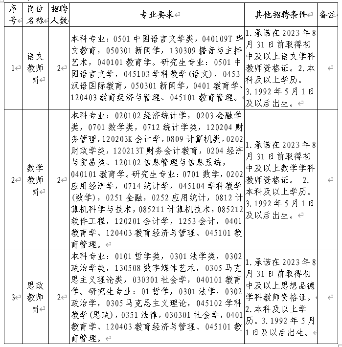 (二)暫未取得相應(yīng)教師資格證書和學(xué)歷學(xué)位證書人員,須承諾在2023年8月31日前取得相應(yīng)教師資格證書和學(xué)歷學(xué)位證書,如未取得,不得聘用。
