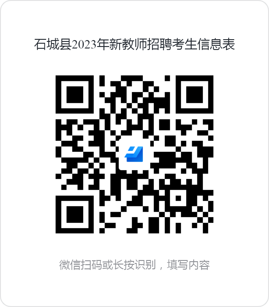 注意:為了便于本此教師招聘工作的開展,請(qǐng)所有考生務(wù)必在現(xiàn)場(chǎng)資格審核前,識(shí)別下方二維碼在線填報(bào)《石城縣2023年新教師招聘考生信息表》。