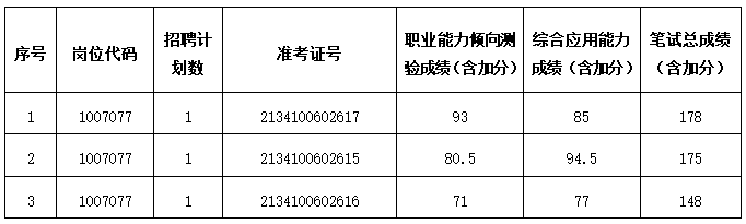 按照筆試成績(達到最低控制合格分數(shù)線且無任一科成績低于60分)從高分到低分順序,根據(jù)招聘崗位計劃數(shù),按1:3比例確定各崗位專業(yè)測試入圍人選(最后一名有數(shù)名考生筆試成績相同的,一并確定為入圍人選),專業(yè)測試入圍人選參加資格復審,入圍人選名單見附件。