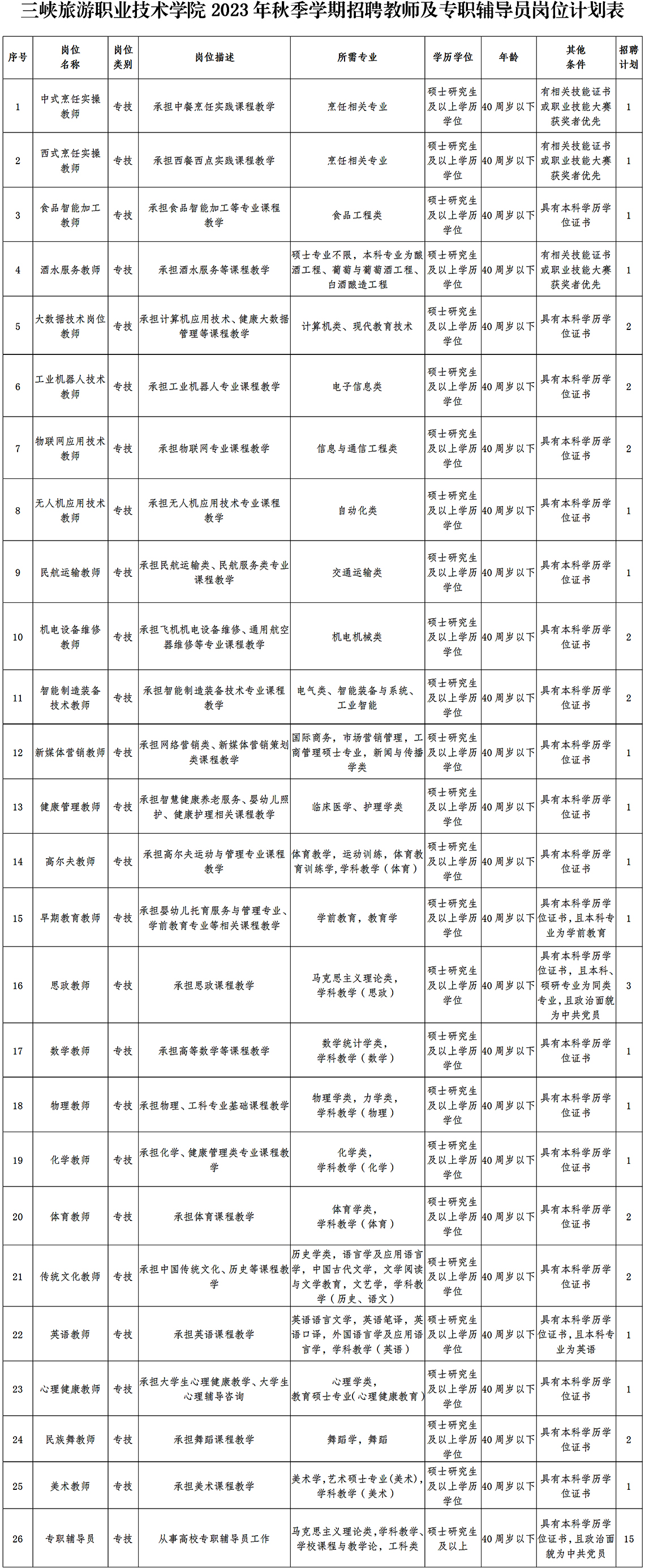 三峽旅游職業(yè)技術學院2023年秋季學期招聘教師及專職輔導員崗位計劃表.docx