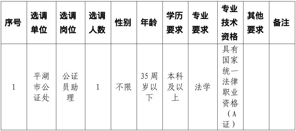 平湖市司法局下屬平湖市公證處事業(yè)單位工作人員1名,用編性質(zhì)為公益二類事業(yè)單位工作人員。