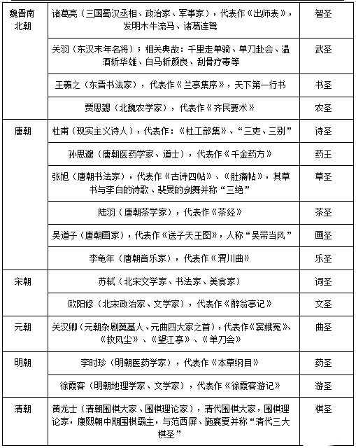 但后續(xù)隨著時(shí)代的變遷,后世人習(xí)慣將在某個(gè)領(lǐng)域取得巨大成就或具有代表性的人物稱為圣賢,如畫圣吳道子、史圣司馬遷、茶圣陸羽等。隨著歷史長(zhǎng)河的奔流不息,各個(gè)領(lǐng)域的代表人物逐漸嶄露頭角。