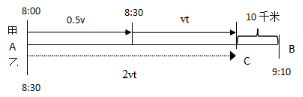 例2:甲車(chē)上午8點(diǎn)從A地出發(fā)勻速開(kāi)往B地,出發(fā)30分鐘后乙車(chē)從A地出發(fā)以甲車(chē)2倍的速度前往B地,并在距離B地10千米時(shí)追上甲車(chē)。如乙車(chē)9點(diǎn)10分到達(dá)B地,問(wèn):甲車(chē)的速度為多少千米/時(shí)( )?
