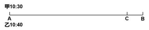 例2:甲、乙兩輛車(chē)從A地駛往90公里外的B地,兩車(chē)的速度比為5:6,甲車(chē)于上午10點(diǎn)半出發(fā),乙車(chē)于10點(diǎn)40分出發(fā),最終乙車(chē)比甲車(chē)早2分鐘到達(dá)B地,問(wèn)乙車(chē)是在何時(shí)追上甲車(chē)的( )?