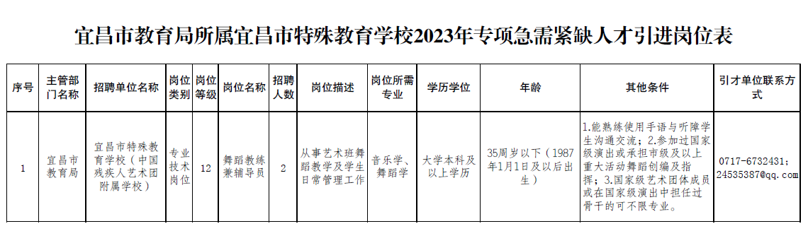 宜昌市教育局所屬宜昌市特殊教育學(xué)校2023年專項急需緊缺人才引進(jìn)公告