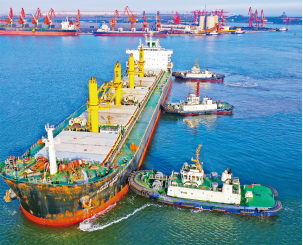 河北省交通優(yōu)勢便利,已經(jīng)形成陸??站C合交通運輸網(wǎng)絡,2022年唐山港貨物吞吐量達到7.69億噸,躍居世界第二位。圖為一艘輪船在拖輪協(xié)助下向河北港口集團唐山港曹妃甸港區(qū)礦石碼頭靠泊。河北省委宣傳部供圖史晟全/攝