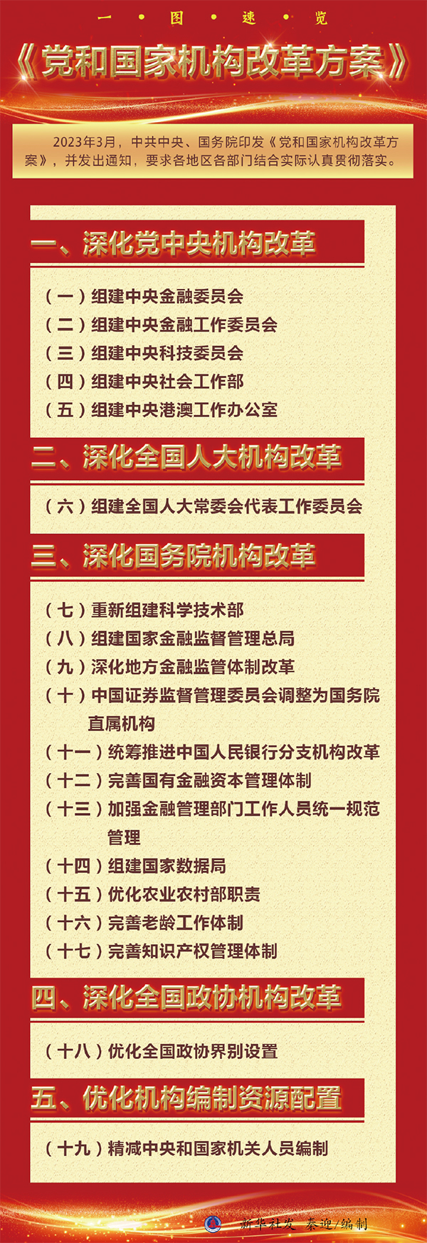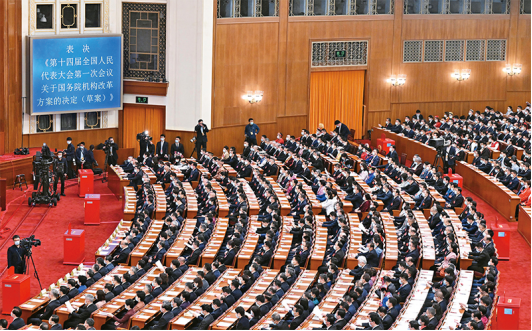 2023年3月10日上午9時許,北京人民大會堂大禮堂。2900多名全國人大代表按下表決器,十四屆全國人大一次會議表決通過了關(guān)于國務(wù)院機構(gòu)改革方案的決定,批準(zhǔn)了根據(jù)《黨和國家機構(gòu)改革方案》形成的國務(wù)院機構(gòu)改革方案。6天后,《黨和國家機構(gòu)改革方案》全文公開發(fā)布,向著強國建設(shè)、民族復(fù)興的宏偉目標(biāo),黨和國家機構(gòu)改革揚帆破浪啟新程。
