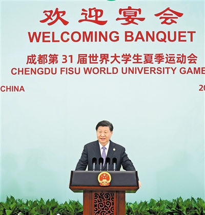 習近平發(fā)表致辭,代表中國政府和中國人民對來華出席成都第31屆世界大學生夏季運動會開幕式的國際貴賓表示熱烈歡迎。(致辭全文見第三版)