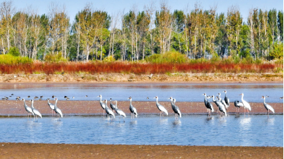 在山東黃河三角洲國家級(jí)自然保護(hù)區(qū)拍攝的白枕鶴(2022年10月18日攝)。新華社發(fā)(楊斌攝)