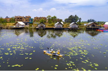 游人在滇池南岸晉寧區(qū)上蒜鎮(zhèn)小漁村劃船休閑(2023年4月30日攝,無人機(jī)照片)。新華社記者陳欣波攝