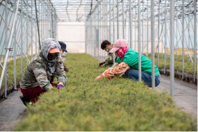 在黑龍江伊春森工集團(tuán)紅松種苗繁育基地,工作人員在養(yǎng)護(hù)輕基質(zhì)紅松苗(2023年5月20日攝)。新華社記者張濤攝