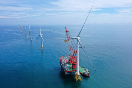 全球首臺(tái)16兆瓦大容量海上風(fēng)電機(jī)組在福建北部海域安裝完成(2023年6月28日攝,無人機(jī)照片)。新華社記者林善傳攝