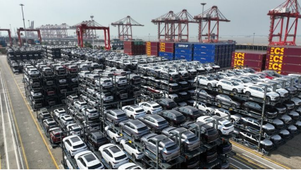在江蘇省太倉港國際集裝箱碼頭,一批新能源汽車即將通過專用框架運(yùn)輸方式出口(2023年7月11日攝,無人機(jī)全景照片)。新華社發(fā)(計(jì)海新攝)