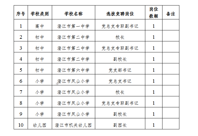 選拔競聘工作在市委教育工作領(lǐng)導(dǎo)小組領(lǐng)導(dǎo)下進(jìn)行,市委組織部和市教育體育局具體負(fù)責(zé)組織實(shí)施,市委編辦、市人社局等部門配合,按照“公開、平等、競爭、擇優(yōu)”的原則,對部分學(xué)校領(lǐng)導(dǎo)人員崗位實(shí)行公開選拔競聘。其中,高中學(xué)校副職1名;初中學(xué)校正職2名、副職2名;小學(xué)學(xué)校正職2名、副職2名,幼兒園副職1名。具體崗位如下: