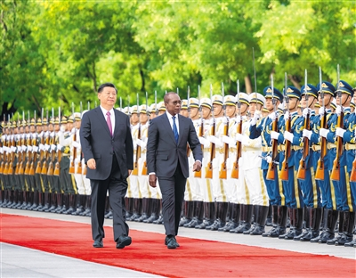 九月一日下午,國家主席習(xí)近平在北京人民大會堂同來華進行國事訪問的貝寧總統(tǒng)塔隆舉行會談。這是會談前,習(xí)近平在人民大會堂東門外廣場為塔隆舉行歡迎儀式。新華社記者 翟健嵐攝
