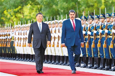 馬杜羅抵達(dá)時(shí),禮兵列隊(duì)致敬。兩國元首登上檢閱臺(tái),軍樂團(tuán)奏中委兩國國歌,天安門廣場鳴放21響禮炮。馬杜羅在習(xí)近平陪同下檢閱中國人民解放軍儀仗隊(duì),并觀看分列式。