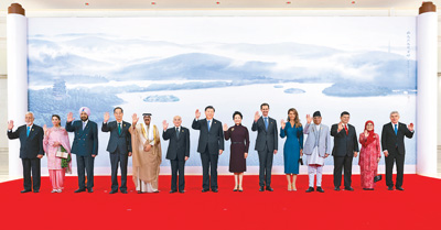 秋日漪園,水光瀲滟,丹桂飄香。習(xí)近平和彭麗媛熱情迎接貴賓,同他們親切握手并合影留念。