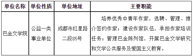根據(jù)《事業(yè)單位人事管理條例》《事業(yè)單位公開招聘人員暫行規(guī)定》和《四川省省屬事業(yè)單位公開招聘工作人員實施細(xì)則(試行)》等規(guī)定,四川省作家協(xié)會(以下簡稱“省作協(xié)”)擬面向社會考核招聘1名工作人員到我會直屬事業(yè)單位巴金文學(xué)院工作?,F(xiàn)將考核招聘有關(guān)事項公告如下。(本公告由省作協(xié)同時在四川省人力資源和社會保障廳官網(wǎng)[rst.sc.gov.cn,下同]“人事考試”專欄和四川作家網(wǎng)[www.sczjw.net.cn,下同]上發(fā)布)