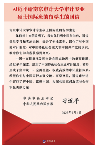 2023年7月4日,習(xí)近平總書記給南京審計(jì)大學(xué)審計(jì)專業(yè)碩士國際班的留學(xué)生的回信。新華社發(fā)