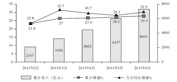 在該題中,柱狀圖與折線圖所代表的的數(shù)據(jù)都是累計(jì)的數(shù)據(jù),這就是時(shí)間的一個(gè)特殊表達(dá)方式,累計(jì)即到該時(shí)間節(jié)點(diǎn)為止該年所有的數(shù)據(jù)之和。因此二季度的數(shù)據(jù)應(yīng)為累計(jì)到6月份的數(shù)據(jù)與累計(jì)到3月份的數(shù)據(jù)差,即為8065-3454億元。一季度的數(shù)據(jù)即為累計(jì)到3月份的數(shù)據(jù)為3454億元,因此2011年二季度軟件業(yè)務(wù)收入增長(zhǎng)率為(8064-3454-3454)/3454×100%=,直除首兩位為33。
