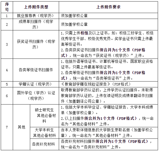 3.上傳應(yīng)聘附件材料。應(yīng)聘畢業(yè)生須通過(guò)招聘平臺(tái)及時(shí)、規(guī)范上傳個(gè)人應(yīng)聘附件材料,應(yīng)聘附件材料文檔數(shù)量不超過(guò)7個(gè)。應(yīng)聘畢業(yè)生應(yīng)確保應(yīng)聘材料能正常打開(kāi)、清晰顯示,因應(yīng)聘材料不能正常打開(kāi)、圖像不清晰或未按規(guī)范要求填報(bào)導(dǎo)致的結(jié)果由應(yīng)聘畢業(yè)生本人承擔(dān)。上傳附件具體要求如下: