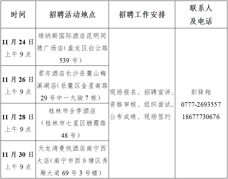 (三)招聘宣講及現(xiàn)場(chǎng)報(bào)名。此次招聘活動(dòng)在昆明市、長沙市、桂林市和南寧市舉辦專場(chǎng)招聘會(huì),招聘現(xiàn)場(chǎng)進(jìn)行宣講活動(dòng)并接受現(xiàn)場(chǎng)報(bào)名,現(xiàn)場(chǎng)報(bào)名截止時(shí)間為當(dāng)天上午10:30。