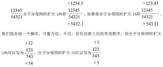 此時(shí),我們會(huì)發(fā)現(xiàn)分子分母同時(shí)擴(kuò)大10%可以看做給分子、分母同時(shí)加上前兩位“12”“54”的一倍;同時(shí)擴(kuò)大1%可以看做同時(shí)加上首位“1”、“5”的一倍。那反過(guò)來(lái)說(shuō),當(dāng)我們只取前三位數(shù)位的有效數(shù)字進(jìn)行估算時(shí),如果分母、分子增加了前兩位的一倍,那么就可以估算為增加了10%;如果分子、分母增加了第一位的一倍,那么就可以估算為增加了1%。