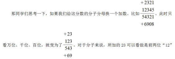 的兩倍減去第一位“1”的一倍,即可以理解為擴(kuò)大了(2×10%-1%=)19%。而對(duì)于分母來(lái)說(shuō),所加的69可以看做是前兩位“54”的一倍加上第一位“5”的三倍,即可以理解為擴(kuò)大了(10%+3×1%=)13%。那么在這個(gè)過(guò)程中,顯然分子的增長(zhǎng)率(19%)大于分母的增長(zhǎng)率(13%),那么這個(gè)分?jǐn)?shù)的分?jǐn)?shù)值就會(huì)變大。這種方法就是今天我們想要教給大家的快速去判斷分子、分母變化“增長(zhǎng)率”的基本原理。