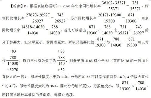 那么到這里我們就會(huì)發(fā)現(xiàn),資料分析中的比較題基本可以使用這三種方式來(lái)進(jìn)行求解。對(duì)于不同的情況,根據(jù)分?jǐn)?shù)的性質(zhì)、分子分母倍數(shù)關(guān)系以及增長(zhǎng)率關(guān)系,就可以輕松比較。希望大家可以多多練習(xí),早日掌握,讓比較不再成為做題的短板。